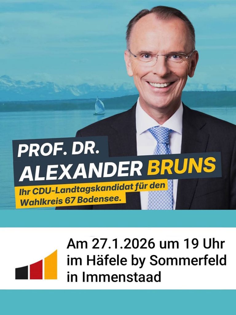 Alexander Bruns kommt am Dienstag, 27. Januar 2026 um 19 Uhr ins Häfele by Sommerfeld. Er steht an dem Abend Rede und Antwort, um das gemeinsame Ziel, am 8. März 2026 wieder ein CDU-Direktmandat vom Bodenseekreis im Landtag zu erreichen.